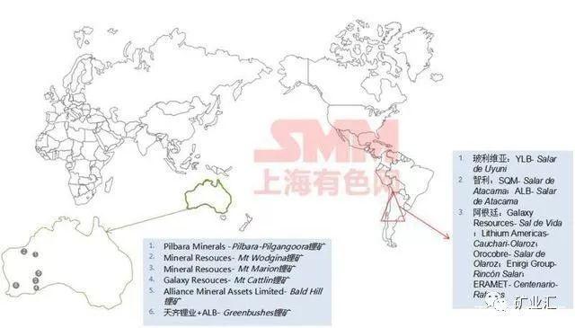 2018年海外鋰礦產量中,67%是來自于鋰輝石礦山,而這些鋰輝石礦幾乎全部來源于澳大利亞。而剩下的鹽湖產量均來自于南美。